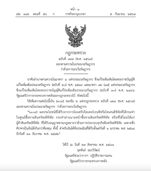 ราชกิจจานุเบกษาได้ประกาศกฎกระทรวงว่าด้วยการยกเว้นภาษีเงินได้บุคคลธรรมดาสำหรับกำไรจากการขายสินทรัพย์ดิจิทัล มีผลบังคับใช้แล้ว หลังคณะรัฐมนตรีมีมติเมื่อวันที่ 17 มิถุนายน พ.ศ. 2568 อนุมัติหลักการมาตรการภาษีดังกล่าว เพื่อผลักดันให้ประเทศไทยก้าวสู่การเป็นศูนย์กลางสินทรัพย์ดิจิทัล (Digital Asset Hub) ของโลก