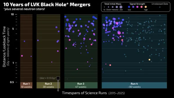 แผนภูมิแสดงการค้นพบที่เกิดขึ้นจากเครือข่าย LIGO-Virgo-KAGRA (LVK) นับตั้งแต่ที่ LIGO ตรวจพบคลื่นความโน้มถ่วงที่แผ่ออกมาจากหลุมดำสองแห่งที่กำลังชนกันเป็นครั้งแรกในปี 2015