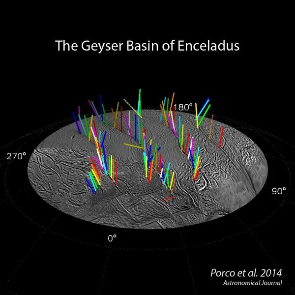 ดวงจันทร์เอนเซลาดัส ดวงจันทร์น้ำแข็งขนาดเพียง 500 กิโลเมตร บริวารของดาวเสาร์ ในอดีตเคยถูกมองว่าเป็นหนึ่งในเป้าหมายสำคัญที่สุดในการค้นหาสิ่งมีชีวิตนอกโลก เนื่องจากพบพวยน้ำแข็งและโมเลกุลอินทรีย์ที่พุ่งขึ้นจากรอยแยกใกล้ขั้วใต้ ซึ่งบ่งชี้ถึงมหาสมุทรใต้ผิวดินที่อาจเอื้อต่อการดำรงชีวิต
