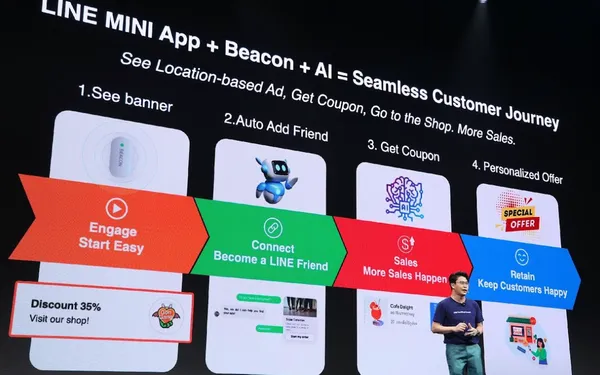 อีกตัวอย่างน่าสนใจในการใช้ LINE MINI App และ AI รวมถึง LINE Beacon พลิกโฉมวงการค้าปลีกไทย คือ AIYA หนึ่งในผู้ให้บริการโซลูชันด้าน Location AI Marketing นำเสนอไอเดียการใช้แบนเนอร์จาก LINE Beacon สร้างการรับรู้แคมเปญหรือดีลเด็ดให้ผู้ใช้ในรัศมีใกล้เคียงร้านค้า เพื่อดึงเข้าสู่ LINE MINI App ได้ แบรนด์สามารถนำข้อมูลที่ได้จาก LINE Beacon และ LINE MINI App รวมถึงฐานข้อมูล CRM ที่แบรนด์มี มาให้ AI ช่วยวิเคราะห์เป็นอินไซต์ เพื่อออกแบบคูปองส่วนลด ดีล Flash Sale หรือข้อเสนอเฉพาะบุคคลกลับไปได้ทันทีอย่าง “ถูกคน ถูกที่ ถูกเวลา” หลังจากลูกค้าเข้ามาใช้สิทธิ์หน้าร้าน แบรนด์ยังสามารถใช้ AI มาช่วยออกแบบโมเดลแนะนำข้อเสนอถัดไป ตามข้อมูลโซนที่เข้าใกล้ วันเวลาและประวัติการใช้สิทธิ์ได้เช่นกัน อีกหนึ่งไอเดียสำหรับธุรกิจเชื่อมโลกออนไลน์กับออฟไลน์ให้ Seamless ใช้ Ads เปลี่ยนเป็นยอดขายได้จริง วัดผลได้ และปรับข้อเสนอตาม Location ได้แบบเรียลไทม์
