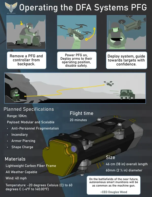 ดีเอฟเอ ซิสเต็มส์ (DFA Systems) สตาร์ตอัปในรัฐนิวเม็กซิโกของสหรัฐอเมริกา เปิดตัวระบบโดรนที่เรียกว่า PFG (Precision Flying Grenade) หรือระบบระเบิดบินแบบแม่นยำ เคลมว่าเหนือกว่าโดรนกามิกาเซ่ทั่วไปใน 2 จุด คือ ทหารคนไหนก็ใช้งานได้ และต้านทานการก่อกวนทางอิเล็กทรอนิกส์ (Electronic Warfare: EW)