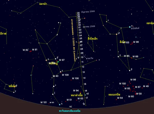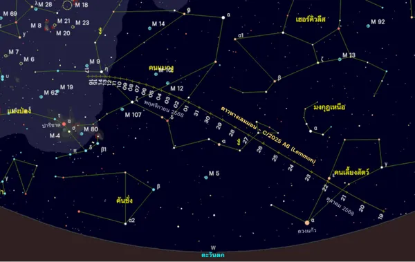 คืนนี้ 21 ตุลาคม 2568 วงการดาราศาสตร์ทั่วโลกจับตาเตรียมจับตา “ดาวหางเลมมอน” (C/2025 A6 Lemmon) ดาวหางดวงใหม่ที่เพิ่งถูกค้นพบเมื่อต้นปี 2568 และกำลังเดินทางเข้าใกล้โลกมากที่สุดในวันที่ 21 ตุลาคม 2568 ที่ระยะราว 89 ล้านกิโลเมตร ก่อนจะเข้าใกล้ดวงอาทิตย์ที่สุดในวันที่ 8 พฤศจิกายน 2568
