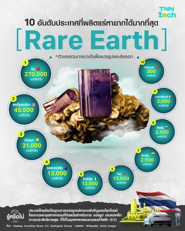 สำหรับประเทศไทย อันดับ 6 การที่มีการผลิตและแปรรูปแร่หายากในปริมาณที่สูงถึง 13,000 เมตริกตัน แสดงให้เห็นว่าไทยมีบทบาทสำคัญในห่วงโซ่อุปทานโลก โดยเฉพาะอย่างยิ่งการเป็นศูนย์กลางการแปรรูปในภูมิภาค ซึ่งทำให้นักลงทุนต่างชาติสนใจที่จะเข้ามาลงทุนเพื่อลดความเสี่ยงจากการพึ่งพาการผลิตและแปรรูปจากประเทศจีนเพียงอย่างเดียว