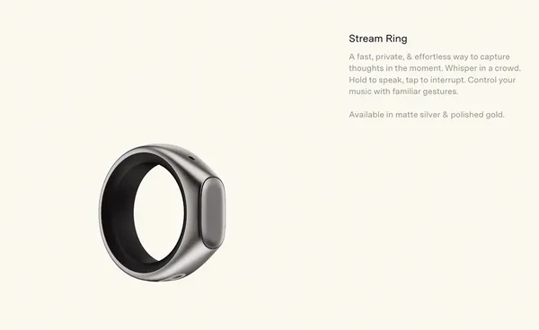 Stream มีดีไซน์เรียบหรูคล้ายแหวนแฟชั่นทั่วไป แต่แฝงด้วยเทคโนโลยีระดับสูง ตัวเรือนผลิตจากวัสดุโลหะขัดเงา มีให้เลือกทั้ง สีเงิน (Silver) และ สีทอง (Gold) ด้านบนเป็นพื้นผิวเรียบที่ทำหน้าที่เป็น แผ่นสัมผัส (Touchpad) สำหรับกด บีบ หรือปัด เพื่อสั่งงานอุปกรณ์ ฟังก์ชันหลักผ่านไมโครโฟนขนาดจิ๋วที่ฝังในตัวแหวน ซึ่งจะเปิดใช้งานเฉพาะเมื่อผู้ใช้แตะและกดค้างบนแผ่นสัมผัส เพื่อบันทึกเสียงหรือพูดคุยกับผู้ช่วย AI ทำให้มั่นใจได้ในเรื่องความเป็นส่วนตัว