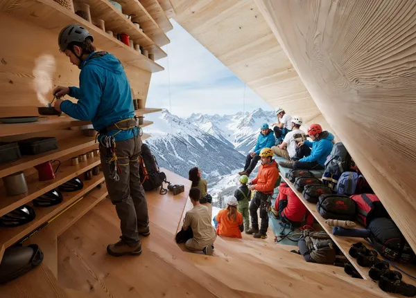 ภายในแม้จะมีพื้นที่จำกัด แต่ คาร์โล รัตตี แอสโซซิอาตี ออกแบบอย่างมีประสิทธิภาพ รองรับผู้พักได้ถึง 9 คน แบ่งโซนชัดเจนทั้งพื้นที่นอน ครัว และส่วนอุปกรณ์สนับสนุน เช่น เครื่องสร้างน้ำจากอากาศ (Atmospheric Water Generator) และเตาเหนี่ยวนำสำหรับให้ความร้อน (Induction Heater) พร้อมพื้นที่พักผ่อนชมวิวภูเขาผ่านผนังกระจก