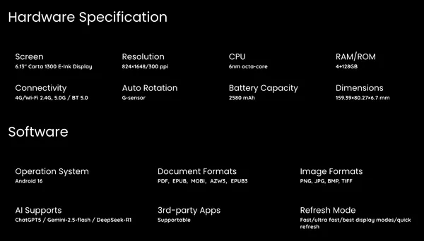 ภายในใช้ชิปประมวลผลแปดคอร์ (8-core) ขนาด 6 นาโนเมตร (6 nm) ทำงานคู่กับแรม 4 กิกะไบต์ (RAM 4 GB) และรอม 128 กิกะไบต์ (ROM 128 GB) พร้อมแบตเตอรี่ความจุ 2,580 มิลลิแอมป์ชั่วโมง (mAh) รองรับบลูทูธ 5.0 (Bluetooth 5.0) และระบบหมุนหน้าจออัตโนมัติ (G-sensor) ถือเป็นเครื่องอ่านอีอิงค์ (E Ink) รุ่นแรกที่มาพร้อมระบบปฏิบัติการแอนดรอยด์ 16 (Android 16) ซึ่งเปิดให้ติดตั้งแอปพลิเคชัน (App) ภายนอกเพิ่มเติมได้