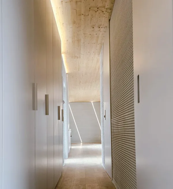 พื้นที่ส่วนท้ายเป็นห้องน้ำและห้องนอนหนึ่งห้อง ใช้เตียงแบบพับเก็บได้ (Murphy bed) เพื่อเพิ่มพื้นที่ใช้สอย พร้อมโต๊ะทำงานขนาดเล็ก ทั้งบ้านติดตั้งระบบทำความร้อนใต้พื้น ช่วยให้เหมาะกับช่วงฤดูหนาวของยุโรป