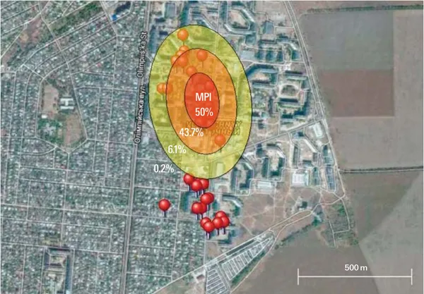 หมุดสีแดง: ตำแหน่งตกกระทบของจรวด 122 มม. จากระบบ BM-21 ที่ยิงจากระยะ 20 กม.