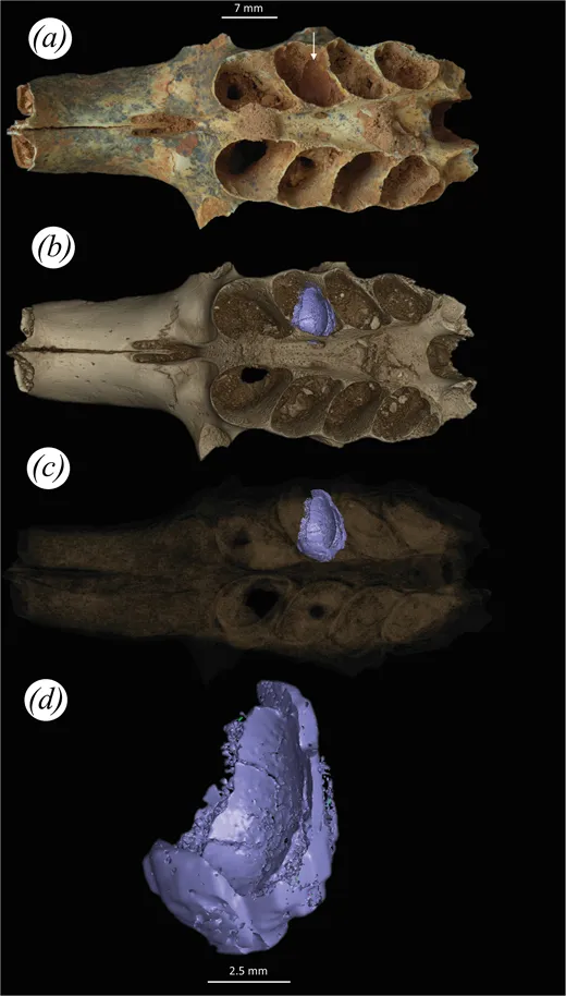 เมื่อสังเกตฟอสซิลใกล้ ๆ เขากลับพบดินที่เรียงรายอยู่ภายในส่วนกระดูกส่วนโพรงฟัน ทำให้เขานึกถึงวิธีที่ตัวต่อใช้สร้างดักแด้ จึงนำกระดูกส่วนนั้นไปทำ ซีที สแกน (CT scan) หรือการเอ็กซ์เรย์ในรูปแบบสามมิติ กลับพบว่ารังดังกล่าวไม่ใช่รังของตัวต่อ ที่ต้องทำจากส่วนผสมของน้ำลายและเส้นใยพืชที่ถูกเคี้ยว