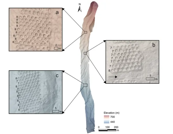 แบบจำลองระดับความสูงดิจิทัลที่ซ้อนทับบนภาพออร์โธโมเสกของมอนเตเซียร์เป เผยให้เห็นรูปแบบการจัดวางภายในส่วน a, b และ c ตัวเลขสีดำแสดงจำนวนหลุมจากทิศตะวันออกไปทิศตะวันตก ลูกศรสีดำในส่วน b แสดงช่องว่างระหว่างส่วนต่าง ๆ ภาพโดย JL Bongers/Bongers, JL, Stanish, C และคณะ/ Antiquity /( CC By 4.0 )