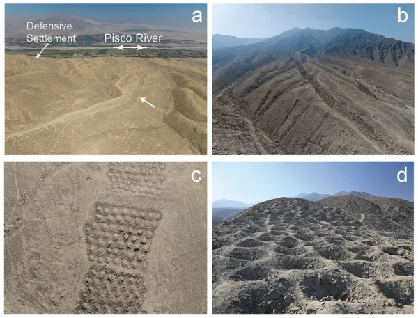 ภาพถ่ายทางอากาศของกลุ่มหลุมและสภาพแวดล้อมโดยรอบ (ac) และภาพถ่ายระดับพื้นดินของหลุม (d)Bongers, JL, Stanish, C และคณะ/ Antiquity /( CC By 4.0 )