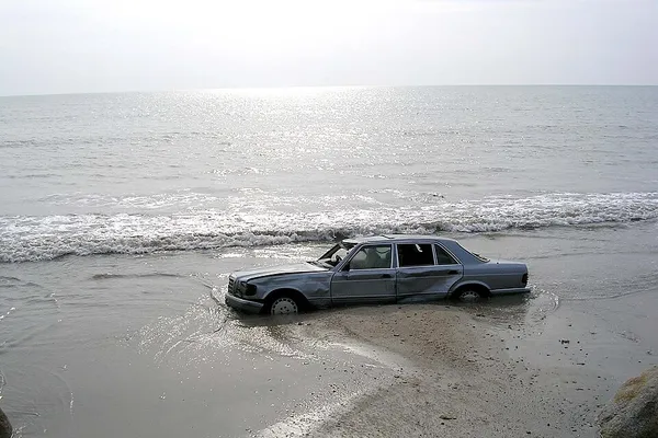 ภาพรถยนต์ที่ถูกคลื่นซัดกลับมาจมริมหาดจากความรุนแรงของสึนามิในภูเก็ต
