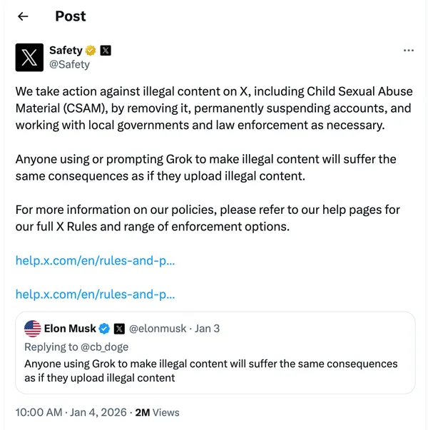 อย่างไรก็ตามภายหลังบัญชี @Safety ของแพลตฟอร์ม X ได้ออกมาโพสต์ข้อความเตือน ว่าจะดำเนินการกับเนื้อหาที่ผิดกฎหมายบน X รวมถึงสื่อลามกอนาจารเด็กโดยการลบออก ระงับบัญชีอย่างถาวร และทำงานร่วมกับหน่วยงานรัฐบาลท้องถิ่นและหน่วยงานบังคับใช้กฎหมายตามความจำเป็น