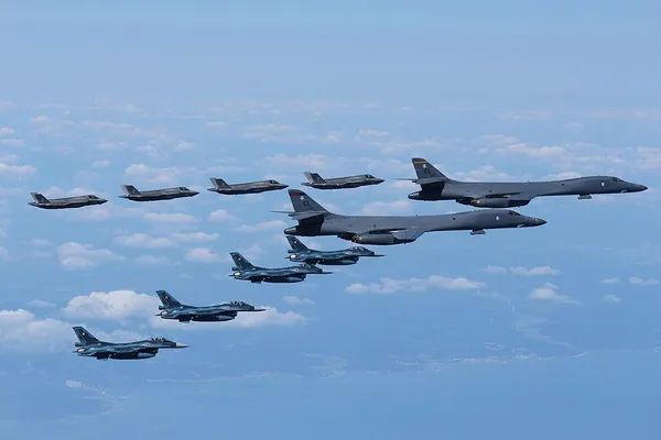 ภาพเครื่องบินขับไล่ F-35, F-2 (F-16 ของญี่ปุ่น) และเครื่องบินทิ้งระเบิดทางยุทธศาสตร์ B-1 Lancer, Wikicommons