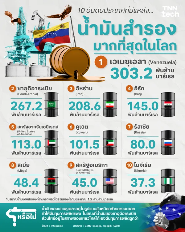 ประเทศที่มีน้ำมันดิบสำรองมากที่สุดในโลกคือ เวเนซุเอลา (Venezuela) ด้วยปริมาณสูงถึง 303.2 พันล้านบาร์เรล มากกว่าประเทศอันดับสองอย่างชัดเจน อย่างไรก็ตาม น้ำมันของเวเนซุเอลาส่วนใหญ่อยู่ในรูปแบบ น้ำมันดิบหนักและกึ่งแข็ง คล้ายยางมะตอย ทำให้กระบวนการผลิตและการกลั่นมีต้นทุนสูง ต้องใช้เทคโนโลยีขั้นสูง ส่งผลให้ศักยภาพการผลิตจริงไม่สอดคล้องกับปริมาณสำรองที่มีอยู่