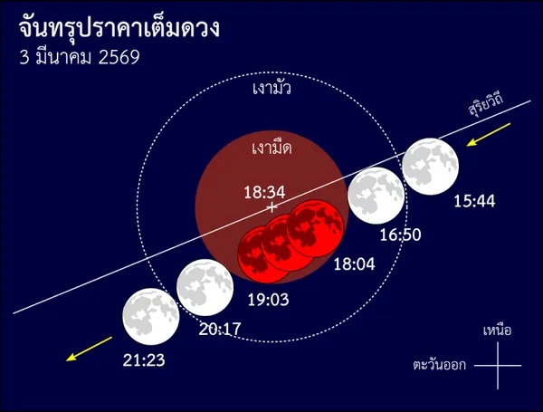 เตรียมกล้องของคุณให้พร้อมและปักหมุดรอชมปรากฏการณ์จันทรุปราคาเต็มดวงครั้งแรกของปี 2569 หรือที่เรียกว่า “ดวงจันทร์สีเลือด” ในคืนวันที่ 3 มีนาคมที่กำลังจะถึงนี้ ซึ่งตรงกับวันมาฆบูชาพอดี