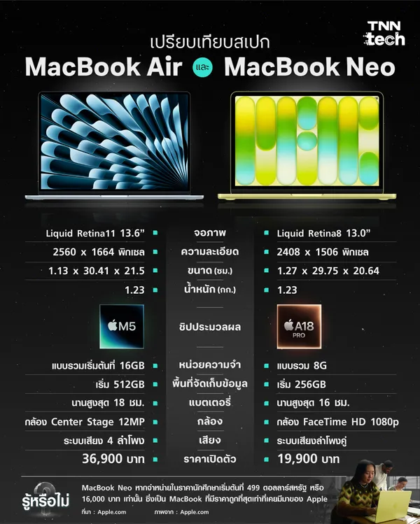 กระแสการเปิดตัวโน้ตบุ๊กรุ่นใหม่จาก Apple กำลังได้รับความสนใจอย่างมากในวงการเทคโนโลยี หลังมีการเปรียบเทียบสเปกระหว่าง MacBook Air รุ่นล่าสุดที่ใช้ชิป Apple M5 กับโน้ตบุ๊กรุ่นประหยัดรุ่นใหม่อย่าง MacBook Neo ที่ใช้ชิป A18 Pro ซึ่งถูกวางตำแหน่งให้เป็นตัวเลือกใหม่ในกลุ่มผู้ใช้ที่ต้องการเครื่อง macOS ในราคาที่เข้าถึงได้