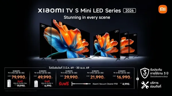 ทีวีอัจฉริยะ Xiaomi TV S Mini LED 2026 มีขนาดหน้าจอให้เลือก 5 ขนาด ได้แก่ 55 นิ้ว, 65 นิ้ว, 75 นิ้ว, 85 นิ้ว และ 98 นิ้ว โดยขนาด 55 นิ้ว วางจำหน่ายในราคาเริ่มต้นที่ 16,990 บาท พิเศษ! ลูกค้าที่ซื้อสินค้าตั้งแต่วันนี้ ถึง 30 เมษายน 2569 รับฟรี Xiaomi Vacuum Cleaner P30 มูลค่า 4,990 บาท2 ที่ Xiaomi Store และร้านตัวแทนจำหน่ายที่ร่วมรายการทั่วประเทศ รวมถึงช่องทางการจัดจำหน่ายทางออนไลน์แพลตฟอร์ม mi.com และ Lazada2