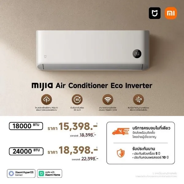 เครื่องปรับอากาศ Mijia Air Conditioner Eco EGAT Label No.5 with 1 Star มีให้เลือกถึง 4 ขนาดได้แก่ 9000 BTU, 12000 BTU, 18000 BTU และ 24000 BTU เพื่อให้ลูกค้าเลือกสรรให้เหมาะสมกับขนาดพื้นที่ที่แตกต่างกัน เครื่องปรับอากาศรุ่นใหม่ล่าสุดของเสียวหมี่รุ่นนี้ชูจุดเด่นด้วยการทำให้ห้องเย็นเร็วภายใน 30 วินาทีเท่านั้น พลังแห่งความการทำความเย็นประสิทธิภาพสูงนี้จะช่วยคลายร้อนให้คุณได้ในทันที นอกจากนี้ตัวอุปกรณ์ยังมีโหมดประหยัดพลังงาน Mijia AI ที่ใช้ AI ในการปรับการใช้พลังงานอย่างชาญฉลาดเพื่อให้ผู้ใช้สามารถติดตามผลลัพธ์ได้แบบเรียลไทม์และช่วยประหยัดพลังงานเพิ่มเติมสูงสุดถึง 20.2% ทั้งยังให้คุณควบคุมได้ง่ายดายผ่านแอป Xiaomi Home และยังสามารถสั่งเปิด-ปิดเครื่องจากระยะไกล ปรับตั้งค่า ตรวจสอบอุณหภูมิ ปรับแต่งโหมด Sleep Curve และตั้งเวลาการทำงานได้ตามต้องการอีกด้วย