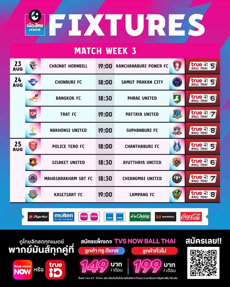 โปรแกรมการเเข่งขันฟุตบอลเมืองไทย ลีก 2024/25 สัปดาห์ที่ 3