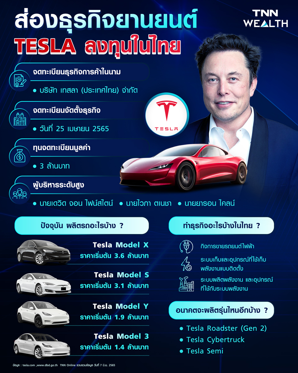 โดยข้อมูลจากเว็บไซต์ กรมพัฒนาธุรกิจการค้า ระบุว่า ปัจจุบัน บริษัท เทสลา (ประเทศไทย) จำกัด ซึ่งเป็นผู้ผลิต-จำหน่ายรถยนต์ไฟฟ้าชื่อดังระดับโลกของ " อีลอน มัสก์ " ได้เข้ามาจดทะเบียนจัดตั้งบริษัทในไทยแล้ว ตั้งแต่วันที่ 25 เมษายน 2565 ด้วยทุนจดทะเบียน 3 ล้านบาท โดยมีวัตถุประสงค์จดทะเบียนตั้งบริษัทในไทย คือ ประกอบกิจการขายรถยนต์ไฟฟ้า ระบบเก็บพลังงานแบบติดตั้งและอุปกรณ์ที่ใช้กับระบบเก็บพลังงานแบบติดตั้ง ระบบผลิตพลังงานและอุปกรณ์ที่ใช้กับระบบพลังงาน