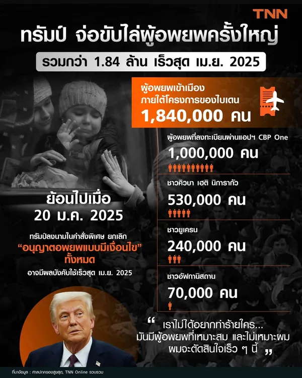 นั่นหมายความว่าจะมีบุคคลต่างชาติมากถึง 1.8 ล้านคนในโครงการ ที่จะถูกส่งตัวกลับประเทศ รวมถึงผู้อพยพเข้าเมือง ราว 1 ล้านคน ที่ลงทะเบียนเข้ารับการคัดกรองอพยพเข้าสหรัฐฯ บริเวณพรมแดน ผ่านแอปพลิเคชัน CBP One