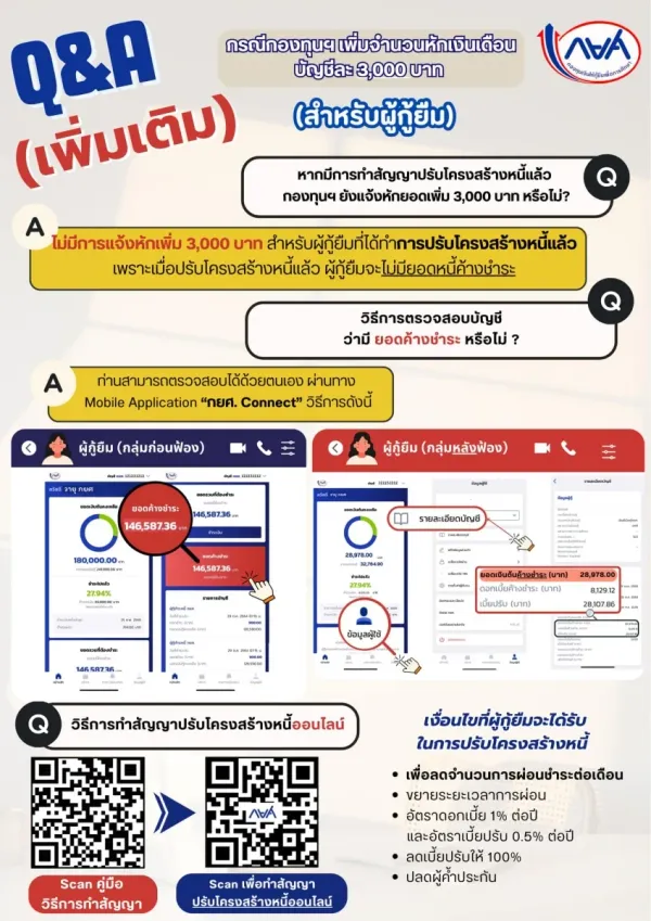 ผู้กู้ที่ไม่ต้องการให้หักเงิน 3,000 บาทสามารถเลือก “ปรับโครงสร้างหนี้” ออนไลน์ได้ โดยสแกน QR Code จากเว็บไซต์ กยศ. เพื่อเข้าสู่ระบบ และยืนยันตัวตนผ่านแอป ThaiID โดยผู้ที่ปรับโครงสร้างหนี้แล้ว จะได้รับสิทธิ