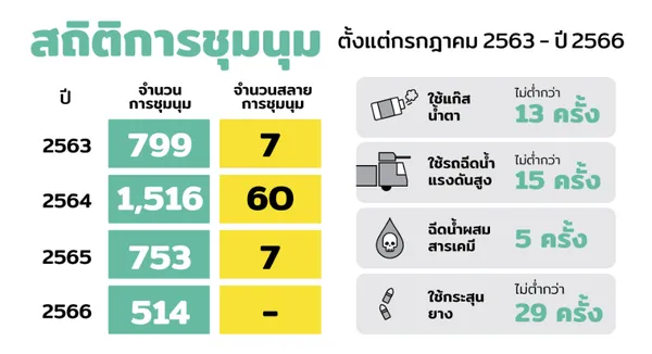 จากข้อมูลของโครงการ Mob Data Thailand จำนวนการชุมนุมในประเทศไทยในช่วง 4 ปีที่ผ่านมาแสดงแนวโน้มที่ผันผวน โดยในปี 2563 มีการชุมนุม 779 ครั้ง เพิ่มขึ้นเป็น 1,516 ครั้งในปี 2564 จากนั้นลดลงเหลือ 753 ครั้งในปี 2565 และอยู่ที่ 514 ครั้ง (ถึงวันที่ 15 ธันวาคม) ในปี 2566 โดยในปีหลังสุดนี้ กรุงเทพฯ เป็นพื้นที่ที่มีการชุมนุมมากที่สุด 343 ครั้ง เทียบกับ 171 ครั้งในต่างจังหวัด ส่วนประเด็นหลักที่ถูกหยิบยกขึ้นในการเคลื่อนไหว ได้แก่ การเรียกร้องสิทธิประกันตัว, การเลือกตั้งและจัดตั้งรัฐบาล, กฎหมายและความยุติธรรม รวมถึงปัญหาเศรษฐกิจและสิ่งแวดล้อม
