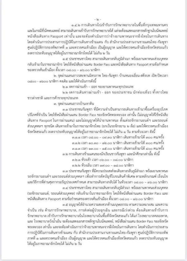 ในกรณีผู้ป่วยที่ต้องเข้ารับการรักษาพยาบาลในโรงพยาบาลไทย เช่น โรงพยาบาลอรัญประเทศ หรือโรงพยาบาลพระยุพราชสระแก้ว จะได้รับการอนุโลมให้เดินทางเข้าประเทศได้โดยใช้ Border Pass และต้องแสดงเอกสารรับรองจากแพทย์ฝั่งกัมพูชาอย่างเป็นทางการ พร้อมใช้ยานพาหนะเฉพาะที่ได้รับอนุญาตเท่านั้น เช่น รถพยาบาล หรือรถรับส่งผู้ป่วย ไม่อนุญาตให้ใช้ Passport และไม่เปิดทางให้บุคคลภายนอกร่วมเดินทาง