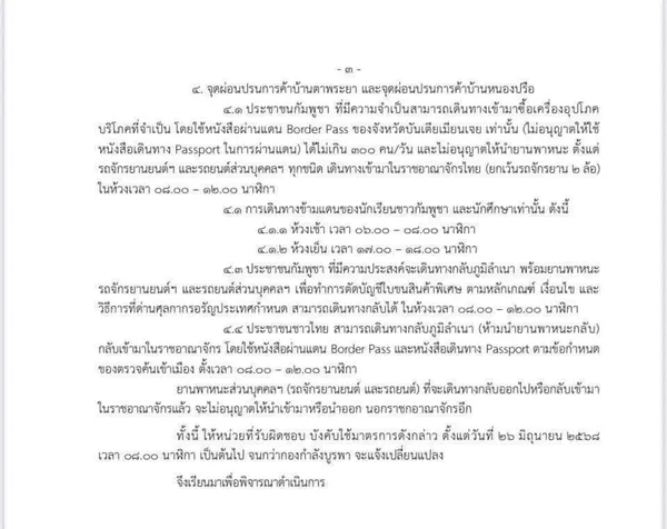 ในห้วงเวลาที่ความตึงเครียดบริเวณชายแดนไทย-กัมพูชาเพิ่มสูงขึ้นจากข่าวลือเปิดด่านโดยไม่ได้รับการยืนยัน กองทัพภาคที่ 1 โดยกองกำลังบูรพา จึงออกมาตรการเร่งด่วนเพื่อควบคุมสถานการณ์ พร้อมรักษาความมั่นคงและระเบียบในพื้นที่ชายแดน โดยเมื่อวันที่ 25 มิถุนายน 2568 ได้ออกหนังสือ “ด่วนที่สุด” แจ้งแนวทางการอนุโลมเปิด-ปิดด่าน เพื่อให้ชาวกัมพูชาที่จำเป็นสามารถเดินทางกลับภูมิลำเนาได้ โดยยังคงจำกัดเข้ม ไม่อนุญาตให้มีการเดินทางเข้าไทยใหม่ทุกกรณี