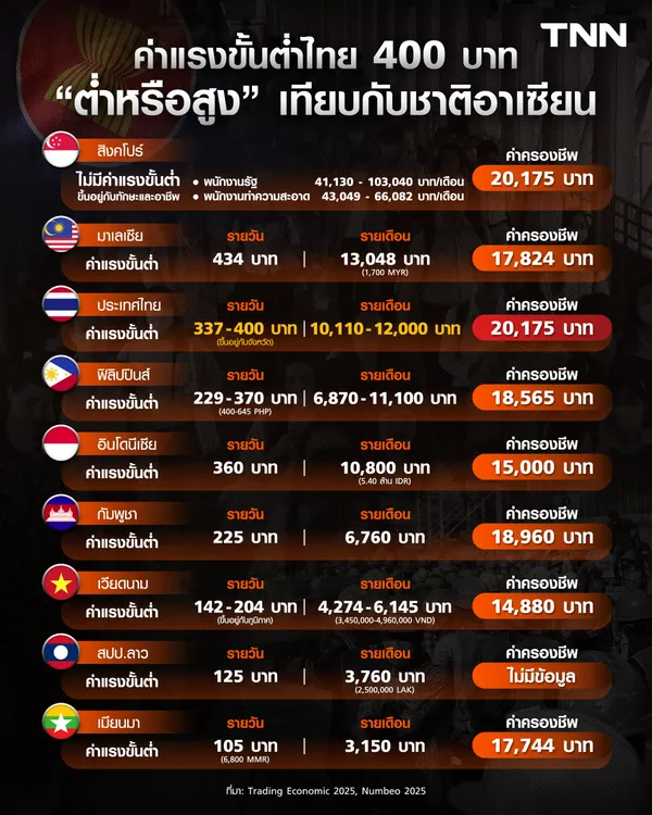 ค่าแรงขั้นต่ำไทย 400 บาทแล้ว แต่เฉพาะใน 5 จังหวัด 1 อำเภอ รวมกรุงเทพมหานคร รวมถึงกิจการโรงแรมและสถานบริการทั่วประเทศ ที่ตรงตามข้อกำหนด แล้วเมื่อเทียบกับเพื่อนบ้านอาเซียน ค่าแรงขั้นต่ำเราสูงแค่ไหน