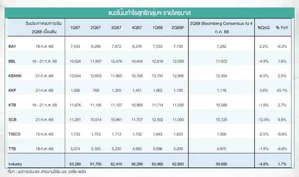 อย่างไรก็ตาม หากงบไตรมาส 2 เป็นไปตามคาด จะทำให้กำไรสุทธิครึ่งปีแรกของปีนี้อยู่ที่ 1.29 แสนล้านบาท (+3% YoY) คิดเป็นสัดส่วน 53% ของประมาณการ กำไรทั้งปีฝ่ายวิจัยคาดว่าจะอยู่ที่ 2.4 แสนล้านบาท ทรงตัว YoY และ 54% ของ Bloomberg Consensus มองว่าแนวโน้มในช่วงที่เหลือของปี (2H68) รายได้ดอกเบี้ยรับจะลดลง ตามดอกเบี้ยนโยบายที่ยังมีโอกาสลงต่อ ขณะที่ Credit cost สูงจากความเสี่ยงลูกหนี้ที่เพิ่มขึ้น จากนโยบายการค้าสหรัฐฯ ซึ่งจะกระทบกับภาคการผลิต เป็นหลัก