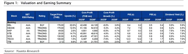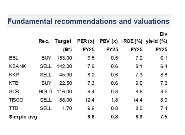 ทั้งนี้เห็นว่าธนาคารคงปันผลระดับสูง dividend yield คาดที่ 6-9% ต่อปี ภาพรวมปี 2025F เรามองการจัดการคุณภาพสินทรัพย์ ทั้งค่าใช้จ่ายสำรอง (credit cost) และหนี้เสีย (NPL) เป็นประเด็นหลัก โดยคาดว่าสถานการณ์ปัจจุบันเป็นระดับที่ธนาคารยังสามารถควบคุมได้ โดยเราคง KBANK และ KTB เป็น Top Pick
