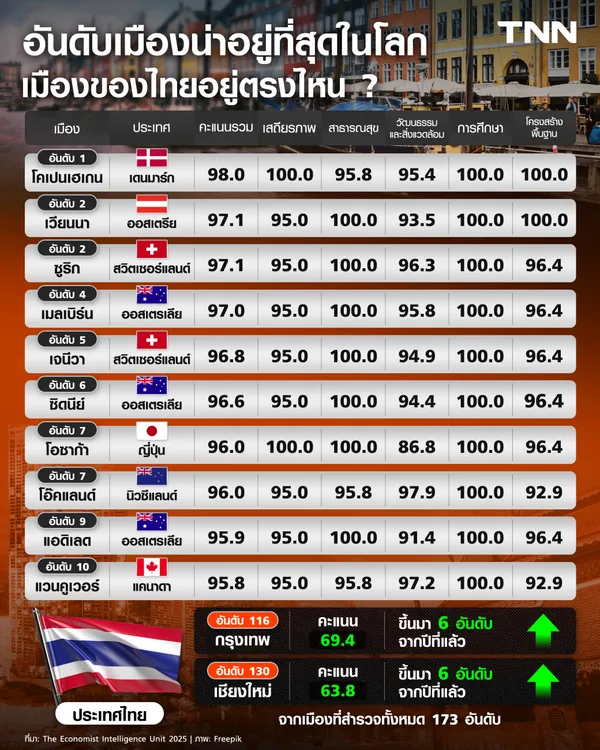 เมืองน่าอยู่ ระบบขนส่งดี อำนวยความสะดวกคนอาศัยต่างก็เป็นเมืองที่ใครๆ อยากอยู่ และการจัดอันดับล่าสุดเรื่องเมืองน่าอยู่ของ The Economist Intelligence Unit (EIU) ได้ประกาศออกมาแล้ว โดยเมืองของไทยอย่างกรุงเทพฯ และเชียงใหม่ มีอันดับดีขึ้น แต่ก็ยังอยู่ในอันดับที่ไม่ได้ดีมากนัก