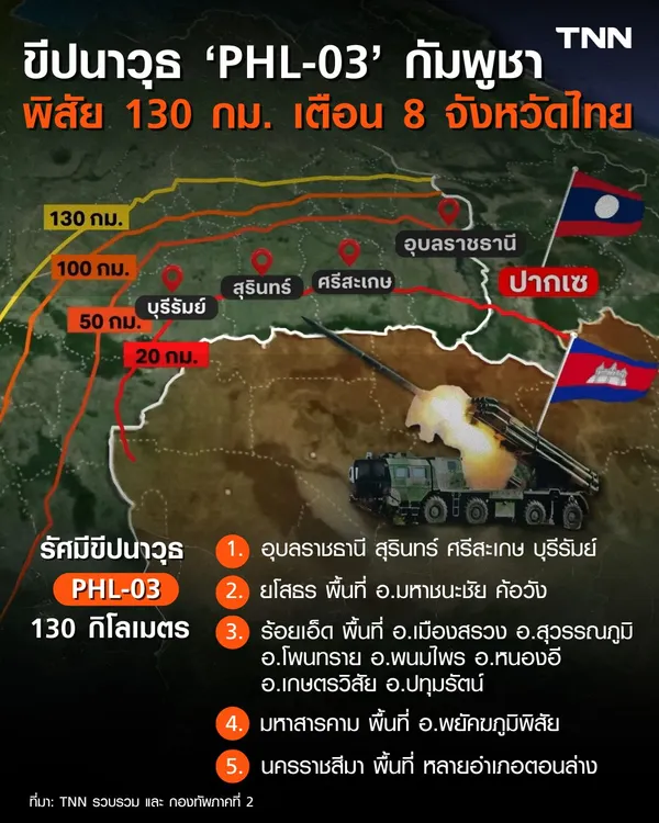 วันนี้ (26 กรกฎาคม) ฝ่ายข่าวกรองแจ้งเตือนว่า กัมพูชาอาจใช้ระบบขีปนาวุธ PHL-03 ซึ่งมีพิสัยยิงระยะไกล 130 กิโลเมตร หวังยิงเป้าหมายยุทธศาสตร์ของไทย กองทัพจึงได้เตรียมแผนป้องกัน และตอบโต้ตามแผนพิทักษ์พื้นที่ส่วนหลัง เพื่อสร้างความเชื่อมั่นให้กับประชาชนชาวไทย