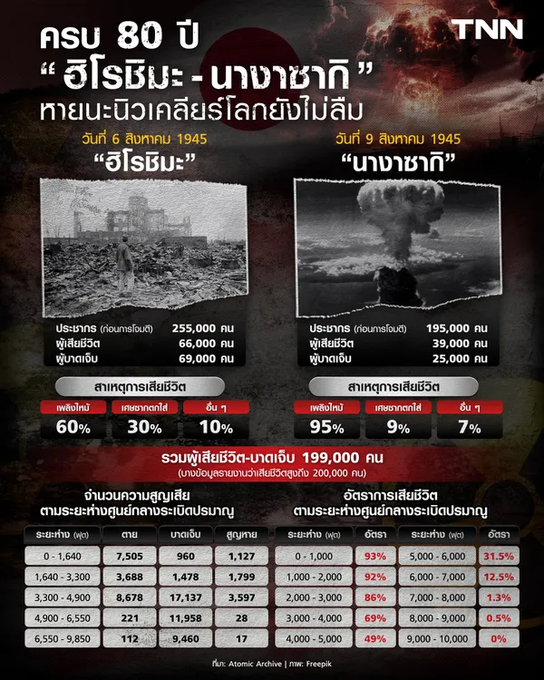 รวมแล้วมีผู้เสียชีวิตทั้งในทันที จากอาการบาดเจ็บ จากระเบิดสองลูกนี้ มากกว่า 200,000 คน และมีประชาชนอีกจำนวนมาก ที่ทุกข์ทรมานจากสารกัมมันตภาพรังสี และการสูญสิ้นวิถีชีวิต