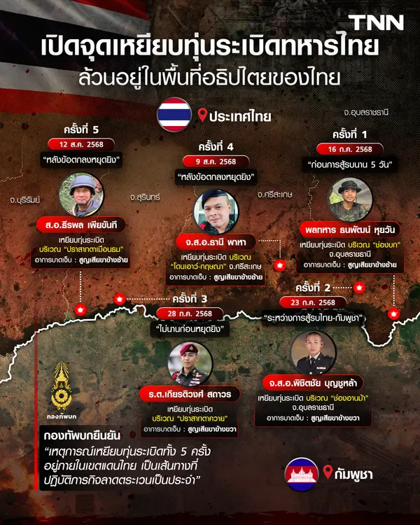 ครั้งแรก คือ เมื่อ 16 ก.ค. 2568 พลทหารธนพัฒน์ หุยวัน เหยียบทุ่นระเบิดบริเวณช่องบก จังหวัดอุบลราชธานี ทำให้เสียขาซ้ายไป
