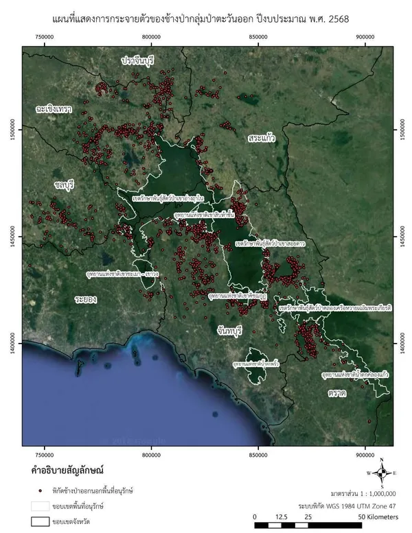 นายอรรถพล เจริญชันษา อธิบดีกรมอุทยานแห่งชาติ สัตว์ป่า และพันธุ์พืช เปิดเผยว่าป่าภาคตะวันออก 799 ตัว ซึ่งพบกว่า 80% ออกมาอยู่นอกป่า และบางส่วนหากินไกลถึง 40 กิโลเมตร
