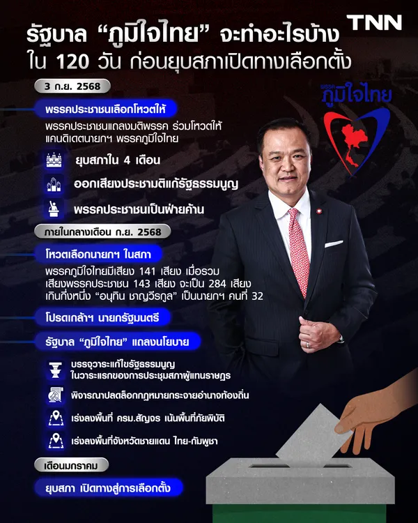 และภายหลังรับพระบรมราชโองการโปรดเกล้าฯ แต่งตั้งเป็นนายกฯ รัฐบาลภูมิใจไทยจะแถลงนโยบายที่จะทำจากนี้ 4 เดือน