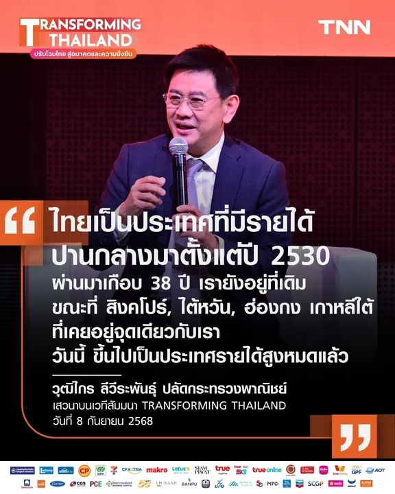 คุณวุฒิไกร ลีวีระพันธุ์ ปลัดกระทรวงพาณิชย์ กล่าวในเวทีเสวนาว่า ปัญหาของเศรษฐกิจไทยไม่ได้จำกัดเพียงความไม่แน่นอนทางการเมืองเท่านั้น แต่ยังรวมถึงการขาดเทคโนโลยี นวัตกรรม และการพัฒนาทุนมนุษย์อย่างจริงจัง ซึ่งเป็นเหตุผลสำคัญที่ทำให้ตลอดกว่า 30 ปีที่ผ่านมา ประเทศไทยยังคงอยู่ในสถานะประเทศรายได้ปานกลาง ขณะที่สิงคโปร์ ไต้หวัน ฮ่องกง และเกาหลีใต้ ต่างก้าวสู่ประเทศรายได้สูงแล้ว แม้ไทยยังคง “อยู่รอด” แต่หลายประเทศที่เคยล้าหลังกลับแซงหน้าไปไกล