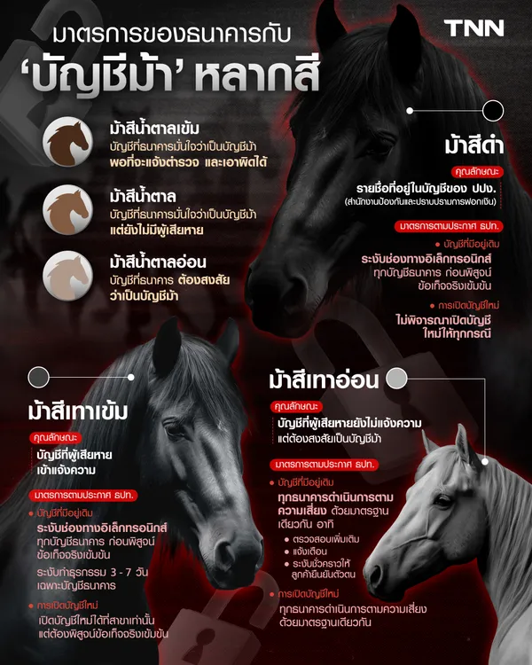 ส่วนบัญชีม้า สีดำ และ สีเทาเข้ม ซึ่งมีความผิดปกติสูงและมีหลักฐานกระทำผิด กลุ่มนี้จะไม่ได้รับการปลดล็อกบัญชีได้ง่าย เพราะต้องตรวจสอบข้อมูลทั้งจากหน่วยงานที่เป็นผู้แจ้งอายัดบัญชี รวมทั้งธนาคารที่เกี่ยวข้องด้วย