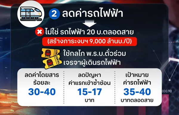 -ไม่ใช่มาตรการรถไฟฟ้า 20 บาทตลอดสาย เพราะเป็นภาระต่องบประมาณระยะยาว และเป็นมาตรการที่ไม่ยั่งยืน โดยต้องใช้งบประมาณอุดหนุนปีละ 8,000-9,000 ล้านบาท
