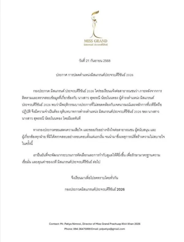 กรณีของ เบบี้ สุพรรณี น้อยโนนทอง ผู้ครองตำแหน่งมิสแกรนด์ประจวบฯ 2026 เพียงหนึ่งวันก่อนถูกปลดจากตำแหน่ง กลายเป็นเหตุการณ์ที่ทำให้สังคมหันกลับมาจับตากฎระเบียบของวงการนางงามอีกครั้ง สิ่งที่เกิดขึ้นไม่ใช่เพียงการสูญเสียตำแหน่งของผู้ชนะ แต่ยังเป็นการยืนยันว่าตำแหน่งเชิงสาธารณะเช่นนี้ผูกพันอย่างแน่นแฟ้นกับมาตรฐานด้านศีลธรรมและภาพลักษณ์ที่เวทีประกาศไว้ตั้งแต่ต้น