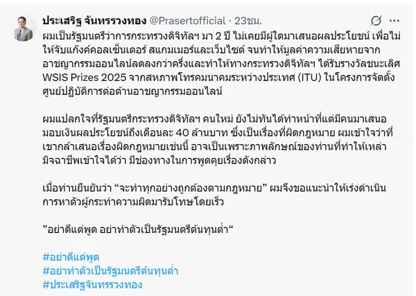 ขณะเดียวกัน นายประเสริฐ จันทรรวงทอง อดีตรัฐมนตรีว่าการกระทรวงดิจิทัลฯ ในรัฐบาลก่อนหน้า ออกมาโต้กลับว่าตลอดสองปีที่ทำงานไม่เคยมีใครมาเสนอสินบนเพื่อไม่ให้จับแก๊งคอลเซ็นเตอร์ พร้อมโชว์ผลงานที่ทำให้ความเสียหายจากอาชญากรรมออนไลน์ลดลงกว่าครึ่ง และได้รับรางวัล WSIS Prizes 2025 จาก ITU ในการจัดตั้งศูนย์ปฏิบัติการต่อต้านอาชญากรรมออนไลน์ นายประเสริฐยังกล่าวถึงเรื่องภาพลักษณ์ว่าอาจเป็นสาเหตุที่ทำให้มิจฉาชีพกล้าเข้ามาเสนอเรื่องผิดกฎหมายแก่รัฐมนตรีคนใหม่