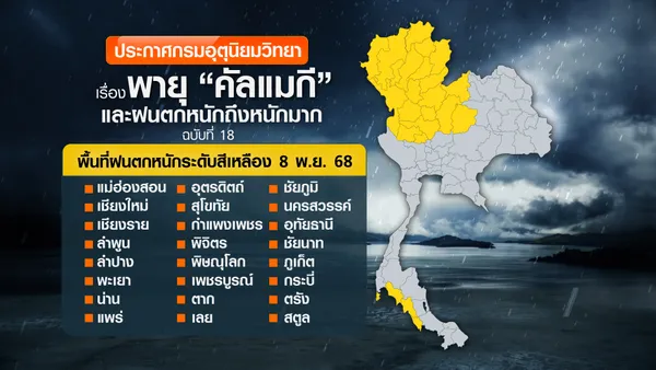 ส่วนประกาศกรมอุตุนิยมวิทยา เรื่อง พายุ “คัลแมกี” และฝนตกหนักถึงหนักมากบริเวณประเทศไทยฉบับที่ 18 หย่อมความกดอากาศต่ำที่อ่อนกำลังลงจากพายุดีเปรสชันคัลแมกี ปกคลุมบริเวณด้านตะวันตกของภาคตะวันออกเฉียงเหนือ และมีแนวโน้มจะเคลื่อนผ่านภาคกลางตอนบน และภาคเหนือ