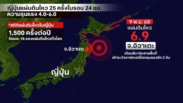 9 พ.ย. 68 เกิดแผ่นดินไหว ขนาด 6.9 ตามการรายงานของสำนักงานอุตุนิยมวิทยาญี่ปุ่น หรือ เจเอ็มเอ ศูนย์กลางใกล้กับชายฝั่งของเมืองโมริโอกะ และเมืองยาฮาบะ ในจังหวัดอิวาเตะ ทางตะวันออกเฉียงเหนือของญี่ปุ่น จนทางการญี่ปุ่น ประกาศเตือนภัยสึนามิหลายพื้นที่