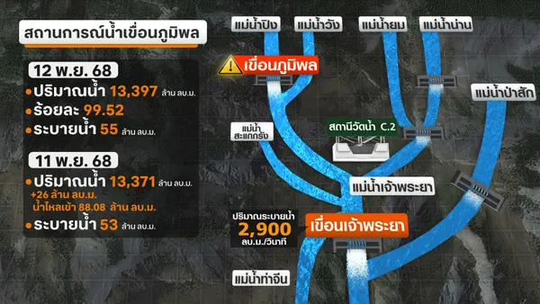 แผนการระบายน้ำเขื่อนภูมิพล วันนี้ คือ 55 ล้านลูกบาศก์เมตร ต่อวัน เพิ่มจากเมื่อวาน ที่ 53 ล้านลูกบาศก์เมตร จากนั้นพรุ่งนี้ (13 พ.ย.68) คณะอนุกรรมการบริหารจัดการทรัพยากรน้ำแห่งชาติ จะประชุมประเมินและปรับเปลี่ยนตามความเหมาะสมของสถานการณ์น้ำและแจ้งให้ทราบต่อไป