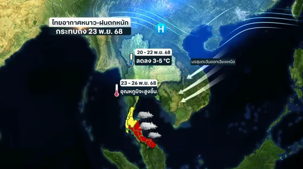 ประกาศกรมอุตุนิยมวิทยา เรื่อง อากาศหนาวเย็นบริเวณประเทศไทยตอนบน ฝนตกหนักถึงหนักมากบริเวณภาคใต้ และคลื่นลมแรงบริเวณอ่าวไทย มีผลกระทบจนถึงวันที่ 23 พฤศจิกายน 2568 ฉบับที่ 11