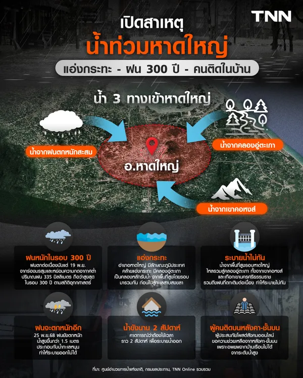 ปี 2568 ถือได้ว่าเป็นมหาอุทกภัยครั้งรุนแรงสุดของหาดใหญ่และภาคใต้ในรอบ 25 ปี และสถานการณ์ยังน่าวิตก เพราะไม่เพียงน้ำ 3 ทางเติมเข้ามาหาดใหญ่ต่อเนื่อง แต่ฝนเองก็ยังตกหนักเช่นกัน