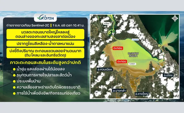 ด้าน GISTDA เฝ้าระวังคุณภาพน้ำในทะเลสาบสงขลาอย่างใกล้ชิด หลังเหตุการณ์น้ำท่วมขังรุนแรงในพื้นที่อำเภอหาดใหญ่และพื้นที่ใกล้เคียงในจังหวัดสงขลา พบมวลตะกอนขนาดใหญ่ที่สูงกว่าปกติ ซึ่งอาจสร้างผลกระทบกับหลายส่วน